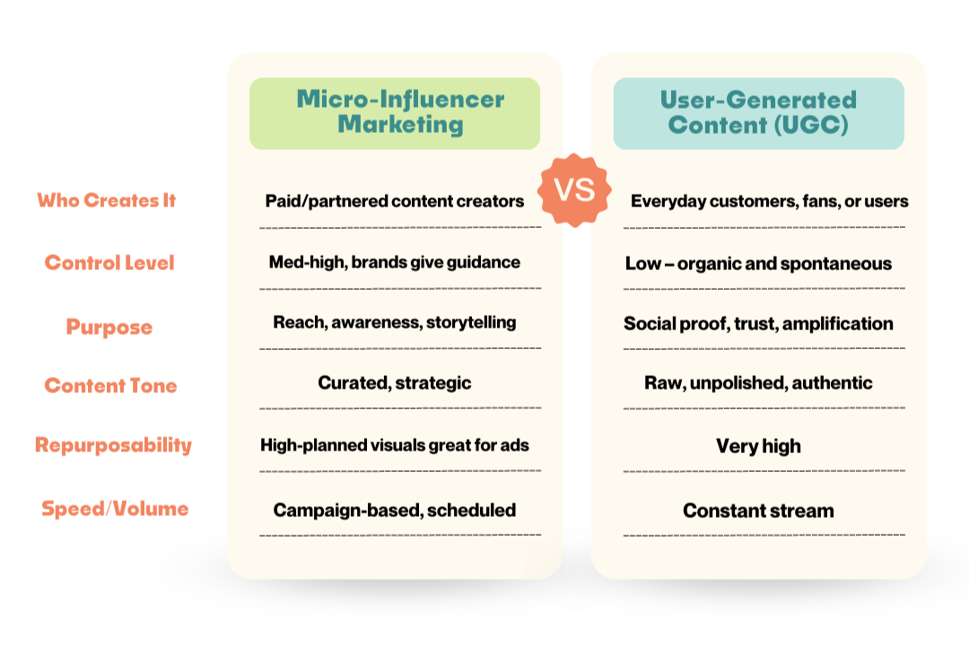 While both micro‑influencers and UGC are effective on their own, combining them can lead to compounding results. Micro-influencers can act as catalysts for UGC – encouraging their followers to post, share, or engage with your brand in ways that naturally spark more content creation.